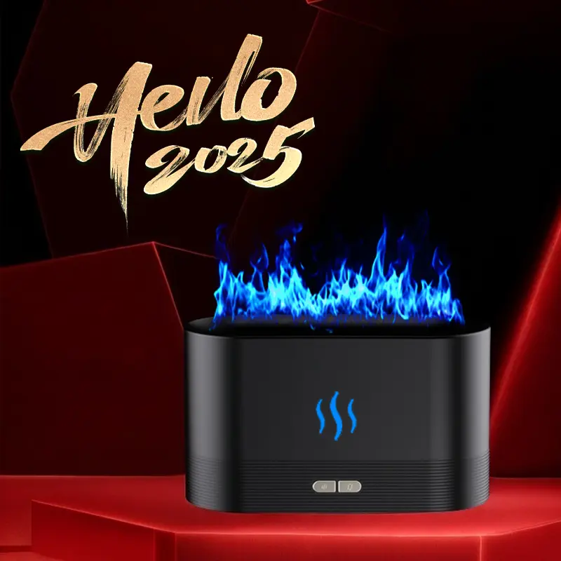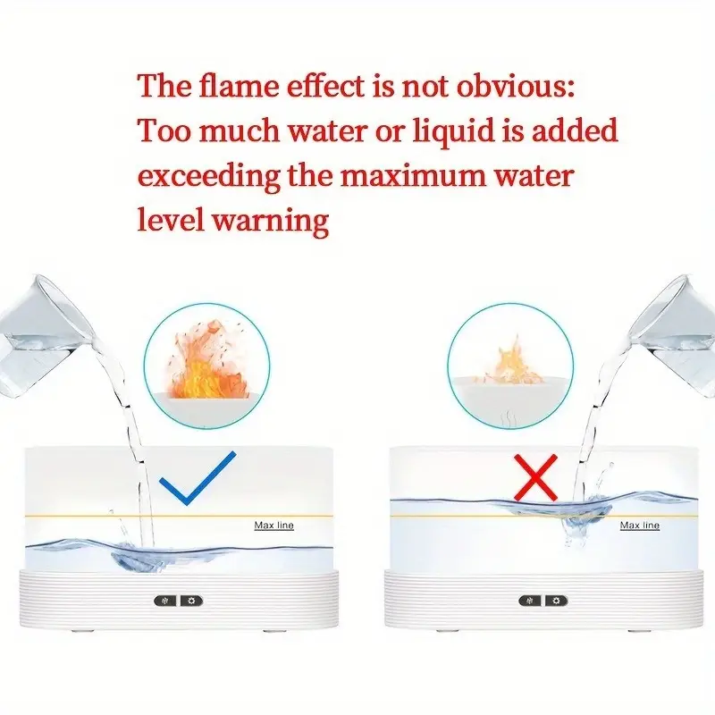 - 🔥 Flame Effect Aromatherapy Diffuser – Made with high-quality PP material, this diffuser combines mist and warm LED light to create a realistic flame effect. Features one-button control with two modes: soft flame and strong flame, adding a cozy and romantic atmosphere to any room. (Use with a 5V 2A adapter for best performance.)